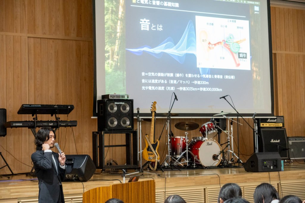 1つ目の講座は『音と電気と音響の基礎知識』。はじめに音の特性について学びました。その後バンドで使われる様々な楽器や歌などの音の特徴や特性を知り、全ての音がバランスよく聴こえるようにするために必要な知識、バンドの音全体を俯瞰する重要性などについて学びました。